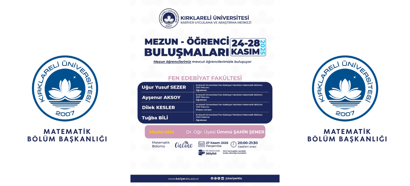 | MATEMATİK BÖLÜMÜ MEZUN – ÖĞRENCİ BULUŞMALARI 54 Okunma Kırklareli Üniversitesi Kariyer Uygulama ve Araştırma Merkezi tarafından düzenlenen “Mezun –... | ||