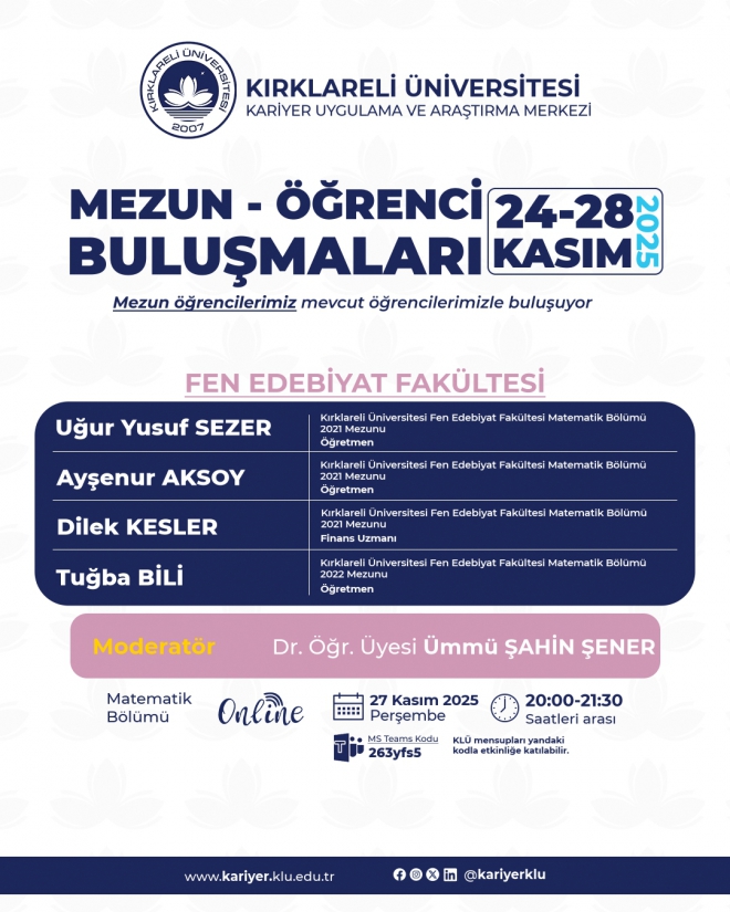 Kırklareli Üniversitesi Kariyer Uygulama ve Araştırma Merkezi tarafından düzenlenen “Mezun – Öğrenci Buluşmaları” etkinlikleri kapsamında, Fen Edebiyat Fakültesi Matematik Bölümü mezunları ile mevcut öğrencilerimiz bir araya gelecektir.