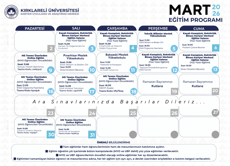 Kırklareli Üniversitesi Kariyer Uygulama ve Araştırma Merkezi tarafından hazırlanan Mart 2026 Eğitim Programı, merkezimizin kullandığı kariyer yazılımı Yetenek Kapısı (www.yetenekkapisi.gov.tr) üzerinden yayımlanmıştır. Öğrenci ve mezunlarımız, Yetenek Kapısı portalına giriş yaparak program kapsamındaki eğitimlere başvuruda bulunabilir.